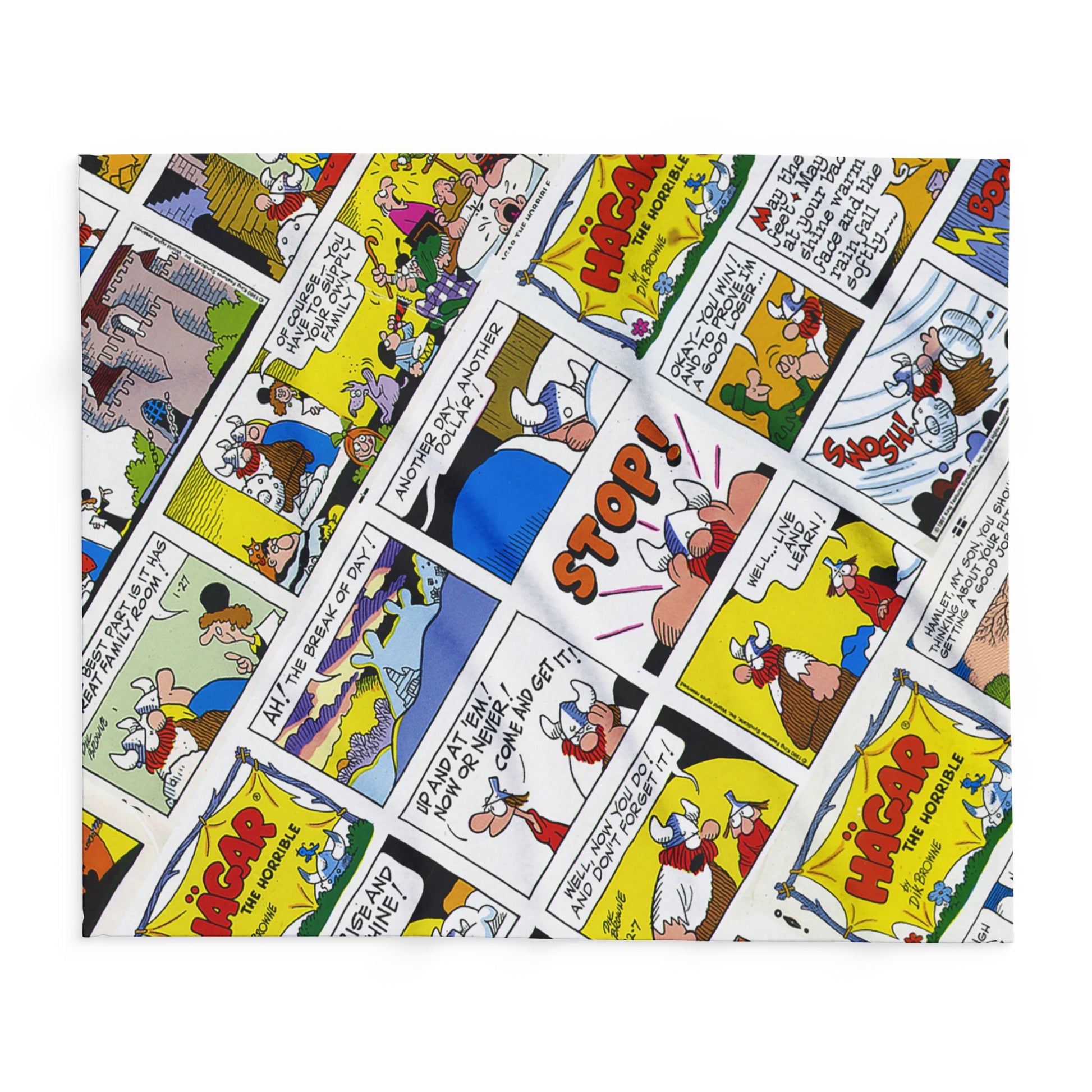 Made with ultra-soft Arctic fleece, it’s perfect for curling up on the couch, adding a bold pop of comic charm to your décor, or gifting to a fellow Hägar fan. Each panel showcases Hägar’s hilarious adventures — from battle cries to breakfast woes — reminding us that even fierce Vikings need a good nap sometimes.